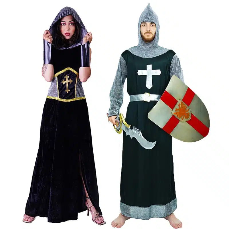 Les accessoires, tels que les gants argentés et l’épée pour la femme, ou le bouclier ornée d’une croix rouge pour l’homme, apportent une touche finale à votre ensemble. Vous vous sentirez prêt à relever tous les défis, que ce soit pour célébrer la Saint-Valentin ou pour animer un événement spécial.