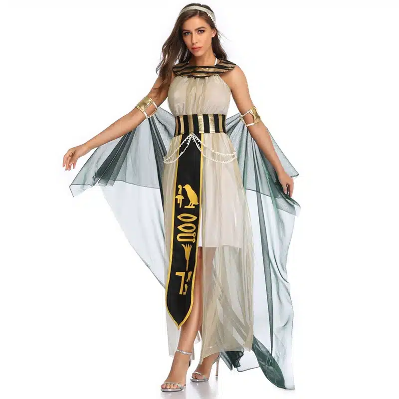 En choisissant ce déguisement, vous ne vous contentez pas d’une simple tenue ; vous adoptez un véritable symbole d’élégance et de charme. La palette de couleurs beige, noir et or se marie harmonieusement, évoquant la richesse des trésors du Nil.
