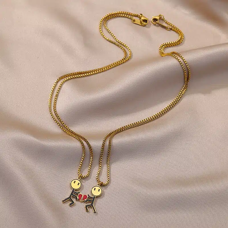 En choisissant ce Collier Couple Plaqué Or, vous offrez un cadeau chargé d’émotion et de sens. Sa couleur dorée éclatante et ses détails soignés en font un bijou qui attire les regards tout en restant discret. Les dessins amusants et tendres des pendentifs apporteront un sourire à votre partenaire, renforçant ainsi le lien qui vous unit.