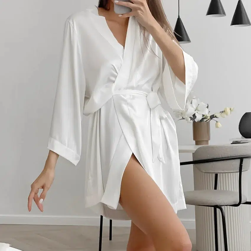 Le peignoir pour femme en soie se distingue par son design minimaliste et raffiné. La teinte blanche éclatante évoque la pureté et la sérénité, tandis que la ceinture à nouer ajoute une touche personnalisable qui souligne gracieusement votre silhouette.