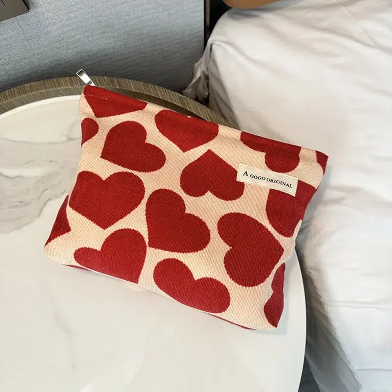 La trousse de maquillage au motif cœur se distingue par sa forme rectangulaire idéale et ses dimensions parfaitement adaptées. Sa taille moyenne permet de ranger vos flacons de parfum et autres produits tout en restant facile à transporter.
