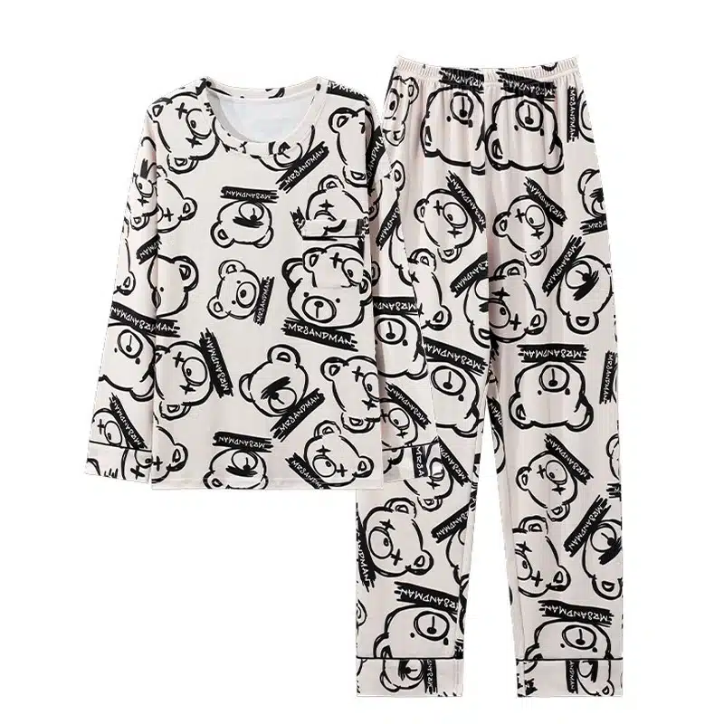 Fabriqué en coton doux et respirant, ce pyjama se veut agréable à porter toute la nuit. Sa teinte grise foncée et son blanc cassé s’harmonisent gracieusement avec les motifs d’ours noirs, alors que la mention ludique “MR8ANDMAN” ajoute une note de fantaisie.